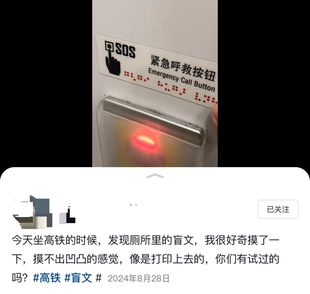 关于上述男子反映情况,极目新闻记者注意到,此前也有其他乘客提出类似情况。2024年8月28日,一名网友通过社交媒体发布了一段在列车厕所内的视频。视频中,网友用手指触碰高铁厕所内紧急呼救按钮提示牌下的盲文,配文称,今天坐高铁的时候,发现厕所里的盲文,很好奇摸了一下,摸不出凹凸的感觉,像是打印上去的。