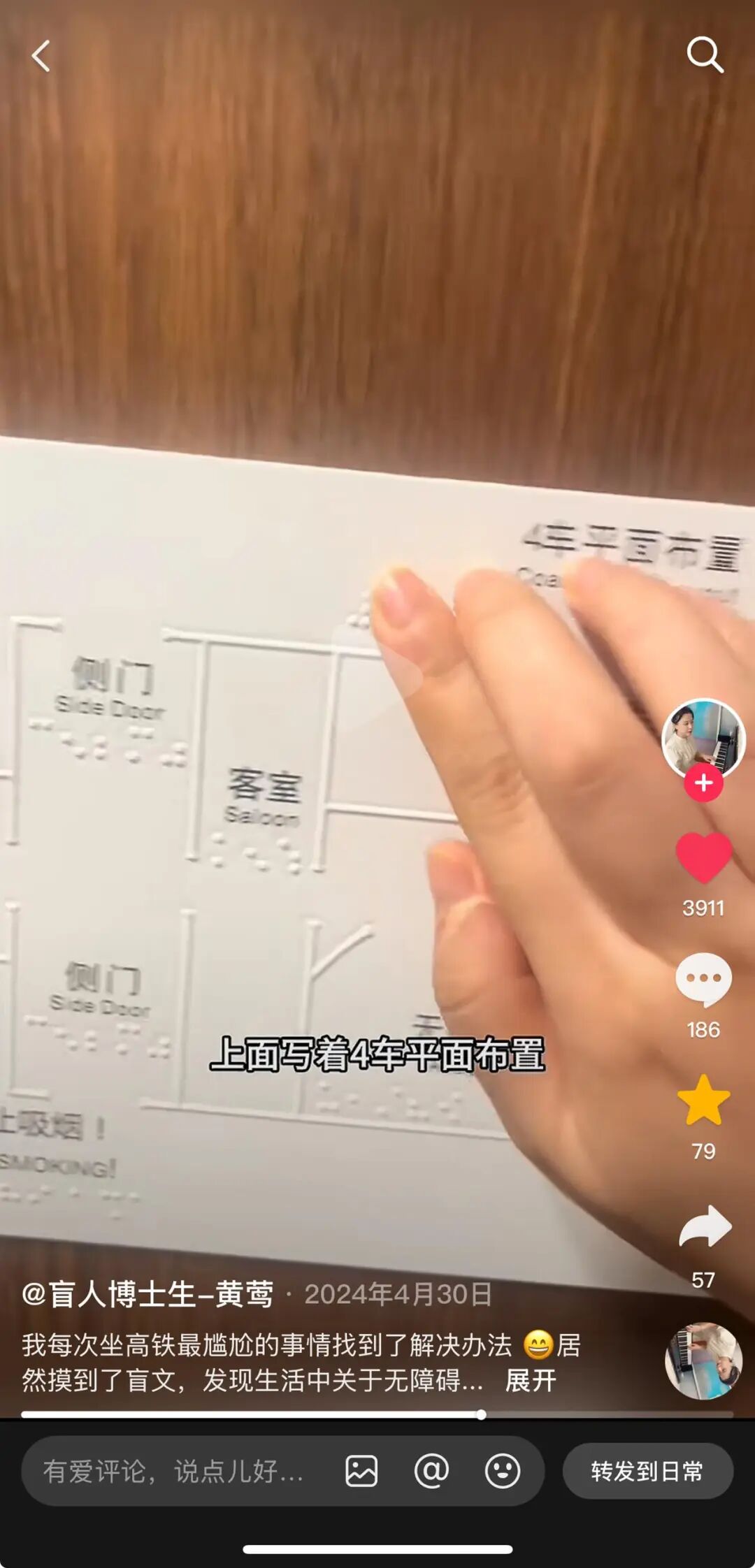 记者还注意到,也有视障人士所乘高铁上的盲文正常可用。2024年4月,全国最美大学生、盲人博士生黄莺曾发视频点赞高铁内的盲文提示。发布的视频中可见,高铁卫生间门口、卫生间内冲水按钮、列车平面图等提示牌上,均设置有盲文,并可观察到盲文上有明显的凸起。她介绍,以前在高铁的卫生间内找不到冲水按钮,“今天发现厕所内有盲文,上面写着‘冲水按钮’,这个提示对于我来说太重要了。”